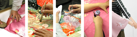例えば、汚れは「丸洗い」や「シミ抜き」だけでなく、着物の伝統的な汚れ落とし加工である「洗い張り(縫いを解いて反物の状態に戻して洗う)」なども承っています。落としきれない汚れやシミは、汚れの上に模様を足して見えなくする「柄足し」を行うなど、着物の状態に合わせて修復していきます。